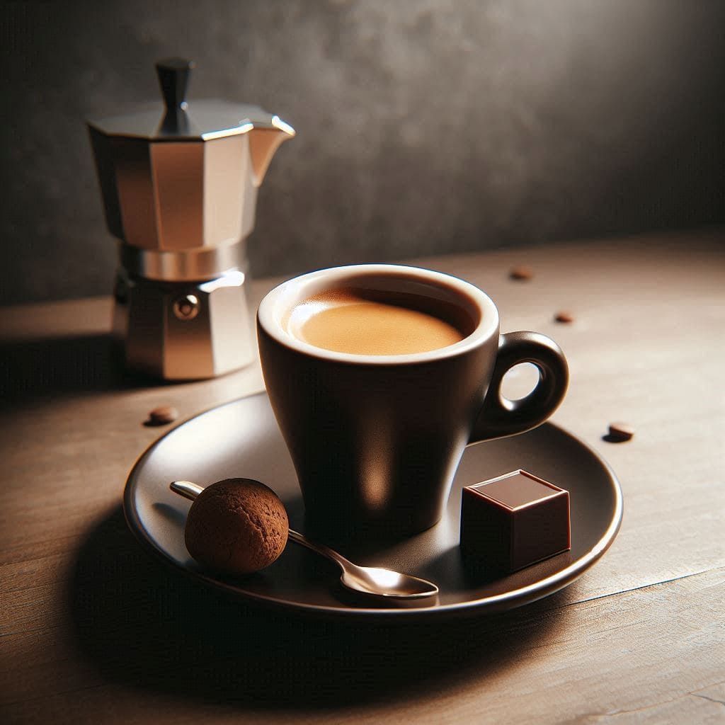 Mała, elegancka filiżanka do espresso na spodku, obok niej kostka gorzkiej czekolady lub małe ciasteczko.