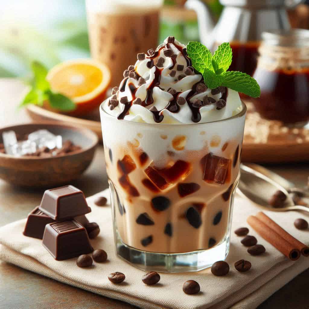 Przezroczysty szklany kubek z kawą mrożoną, ozdobiony bitą śmietaną, kawałkami czekolady lub syropem.